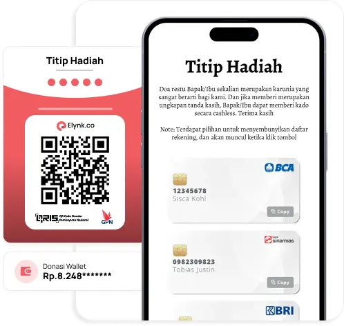 Elynk menyediakan sistem amplop digital terintegrasi yang memungkinkan tamu mengirimkan hadiah berupa uang secara online.