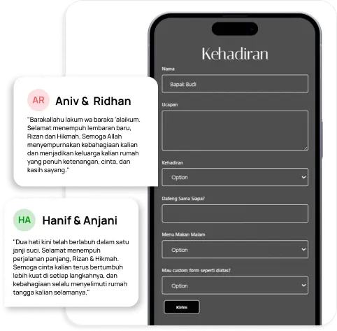 Kelola konfirmasi kehadiran tamu dengan sistem RSVP yang dapat disesuaikan sepenuhnya. Kamu bisa mengatur pertanyaan RSVP sesuai kebutuhan acara, menentukan status kehadiran, serta membatasi jumlah orang yang boleh dibawa oleh setiap tamu.