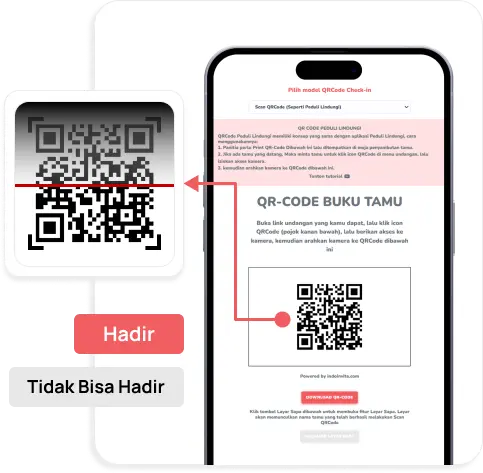 Setiap tamu mendapatkan QR Code unik untuk proses check-in di lokasi acara. Saat hari acara, tamu cukup memindai QR Code untuk melakukan registrasi kehadiran.
